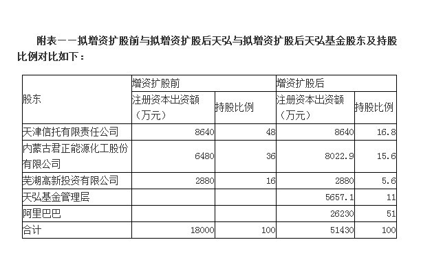 中国证券网讯(记者覃秘)10月9日晚间,因重要事项未公告而停牌一天的内蒙君正发布公告,内容果然与市场关注的焦点天弘基金有关。据公告,阿里巴巴将出资11.8亿元认购天弘基金26230万元的注册资本,完成后占其股本的51%。同时,内蒙君正也将跟随增资,拟出资6943万元认购1542.9万元的注册资本出资额,不过其持股比例仍将从36%降至15.6%。