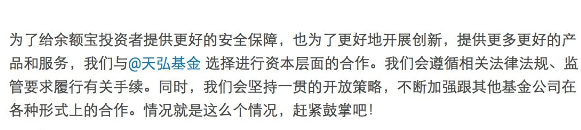 在天弘基金此次增资前,市场传闻天弘基金与阿里还有一系列更加深入的合作,诸如推出新的互联网基金产品。分析认为,一旦此次增资完成,成为“一家人”的阿里和天弘基金,在互联网和金融合作方面,无疑有更强的创新动力。