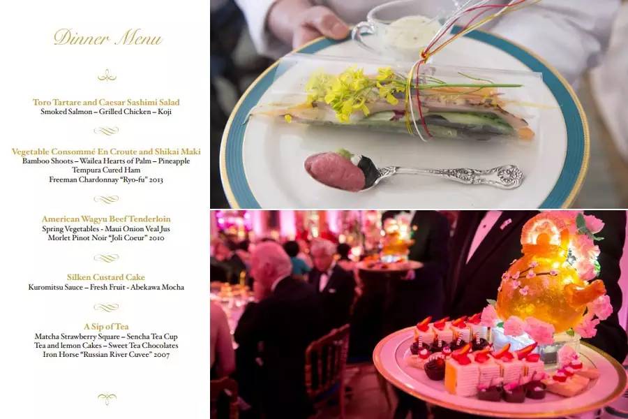 2015年4月28日,美国总统奥巴马在白宫宴请日本首相安倍晋三,国宴菜品在传统西餐搭配的基础上加入了日本元素。菜品包括生鱼片、和牛牛排、日本麻糬等,还有用豆腐和豆奶制成的奶酪蛋糕,以及白宫厨师特别用糖制作的樱花茶壶。