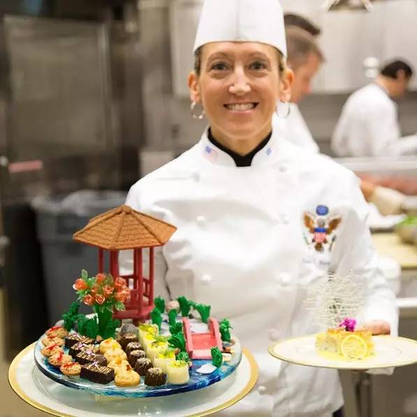 准备国宴的另一位重要的大厨是白宫甜点主厨,2014年白宫迎来了第7位甜点主厨苏珊·莫里森。莫里森负责为白宫所有的社交活动制作甜点,包括国宴、午宴、招待会。