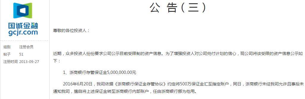 折腾了大半年的国诚金融兑付危机再生波澜,连发5条公告以及3条置顶消息对兑付进展进行说明,在其中一则公告中,明确指责其保证金托管行——浙商银行私自挪用保证金达500万元。