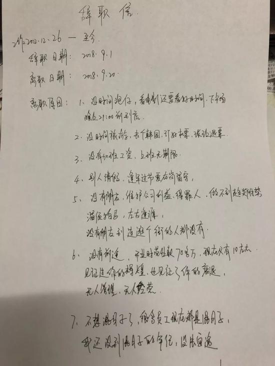 在辞职信中,她列出了7条离职原因。