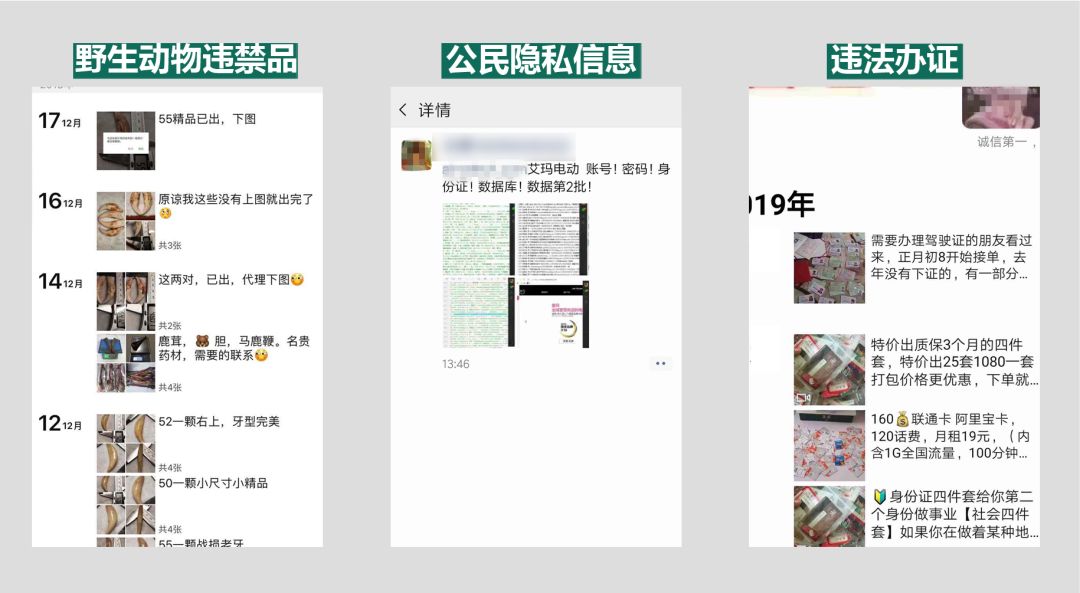 共计对2800多个发布“违法违禁品”售卖信息的微信帐号进行阶梯式处罚;对1200多个发布“违法违禁品”售卖信息的微信群进行阶梯式处理;对900多个发布“违法违禁品”售卖信息的链接进行封禁处理。