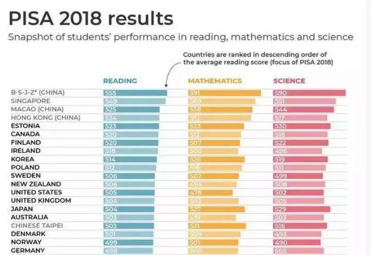 经济合作与发展组织(OECD)3日发布“2018年国际学生评估项目结果”,中国学生在阅读、数学和科学三项测试中的成绩均超越新加坡,位居排行榜第一名。