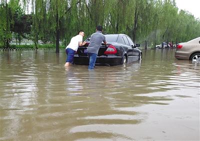 两男子推着熄火的车前行。昨日,地铁天通苑北站外至少有4辆车因积水抛锚。新京报记者 李宁 摄
