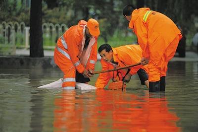 三名工人在积水中架设水泵。北京养护集团出动两辆排水车在天通苑北站外排水。新京报记者 吴江 摄