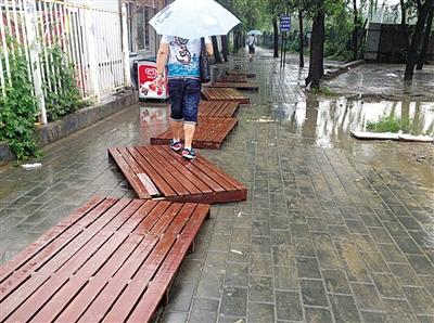 霍营地铁站A出口外,行人走在木板通道上。昨日,因积水,地铁人员放置木板方便乘客。新京报记者 李宁 摄