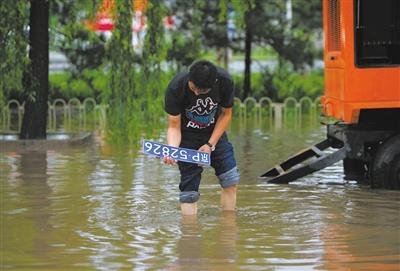 一位车主在积水中寻找自己丢失的车牌,却捞出来另外一辆涉水车车牌。 新京报记者 吴江 摄