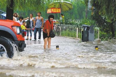 新京报讯 昨日,北京迎来今年最大降雨。暴雨造成北京多个地铁站门口积水,乘客需蹚水方能顺利乘坐地铁。天通苑北地铁站门口,积水最深处超过膝盖,造成至少4辆车抛锚。