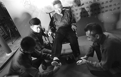 昨日,大栅栏,内联升千层底布鞋制作技艺第四代传承人何凯英穿上徒弟亲手制作的布鞋。何凯英为鼓励徒弟,特意准备了钳子、锥子、锤子这3样做鞋工具,当场送给3位徒弟。
