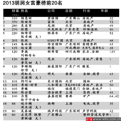 另外,桑德环境董事长文一波的夫人张辉明以60亿元排26位,海普瑞董事李坦以52亿元排31位,联化科技、立讯精密、信立泰、亚厦股份、京运通等均榜上有名,东方园林董事长何巧女则以105亿元登上了全球白手起家女富豪的第13位。![]()