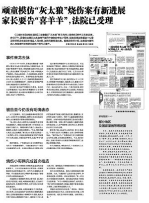 今年4月10日,江南时报《三顽童模仿灰太狼烤羊肉两人被烧伤》报道成为全国媒体关注焦点,此事随即也引起连云港市法律援助中心重视,特事特办受理援助案件,指派律师打起国内首例因人身损害纠纷而状告动画片制作方官司。在包括江南时报等全国媒体的关注下,“模仿灰太狼烤羊肉烧伤孩童”事件让动画市场吹新风,近日,全国20家动画机构联合倡议“做对孩子有益无害的动画片”。而前天晚上,央视《新闻联播》更是直接点名批《喜羊羊》等动画暴力粗俗。