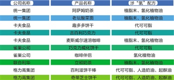 这些知名涉“氢”产品包括嘉顿特脆饼干、旺旺煎饼、乐天蛋黄派,日本格力高集团旗下百利滋饼干棒、奇蒂芝士饼干同时含有代可可脂、人造奶油和起酥油。而韩国好丽友公司旗下的巧克力派和Q蒂蛋糕中分别含有起酥油和代可可脂,好丽友另一款畅销产品“薯愿”中则含有氢化植物油。