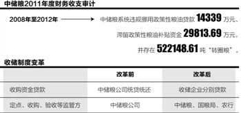 国家审计署今年5月10日公布的中储粮2011年度财务收支审计结果显示,2008年至2012年,中储粮总公司本部及部分所属单位违规挪用政策性粮油贷款14339万元、滞留政策性粮油补贴资金29813.69万元,并存在522148.61吨“转圈粮”。