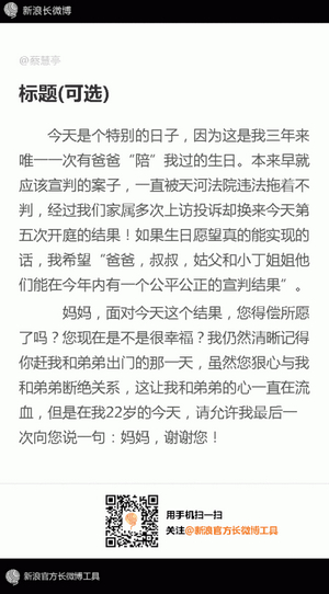 “妈妈,面对今天这个结果,您得偿所愿了吗?您现在是不是很幸福?我仍然清晰记得你赶我和弟弟出门的那一天,虽然您狠心与我和弟弟断绝关系,这让我和弟弟的心一直在流血,但是在我22岁的今天,请允许我最后一次向您说一句:妈妈,谢谢您!”