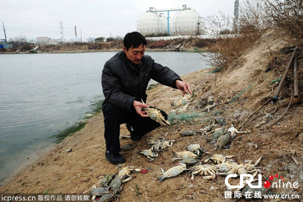 2013年12月21日,山东青岛开发区十字路园社区居民孙明良靠近原油泄露海边的养殖池内养殖的螃蟹大量死亡。图片来源:IC/东方IC