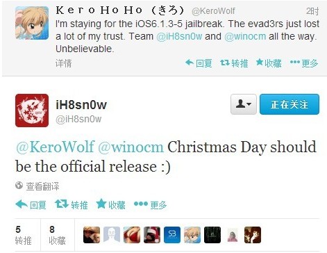 好消息是,随后越狱大神iH8sn0w又多次在推特上强调,将可能会在圣诞节这天放出iPhone5 ios6.1.4完美越狱工具。