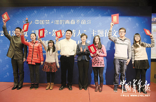 2013年度“助学·筑梦·铸人”主题征文系列传播活动获奖师生举起荣誉证书拍照留念。本报记者 陈剑摄