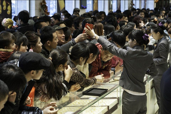 金价大跌中国民众买金盛况:排20分钟才“看上一眼”