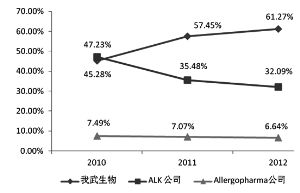 目前国内变应原制品行业处于寡头垄断市场,市场基本被我武生物、丹麦的ALK和德国的A1lergopharma三家公司垄断。从2012年的市场占有情况看,我武生物的尘螨脱敏治疗药物市场占有率为61.27%,行业排名第一,ALK公司市场占有率为32.09%,排名第二,A1lergopharma 公司市场份额为6.64%,排名第三。值得注意的是,我武生物近几年国内市场份额呈现较快增长趋势,2010年~2012年,公司“粉尘螨滴剂”在同类产品中的市场占有率分别为45.28%、57.45%和61.27%。同比之下,ALK和A1lergopharma 两家公司的市场份额则呈快速下滑状态,ALK公司2010年~2012年的市场占有率分别为47.23%、35.48%和32.09%;A1lergopharma公司2010年~2012年的市场占有率分别为7.49% 、7.07% 和6.64%。