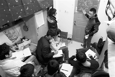 这间10平米的寝室两边靠墙的位置,摆着“下桌上铺”的学生床位,并排仅能坐下4人,却被18名听课的人挤得满满当当。有的学生搬来椅子,有的则干脆站着听讲。虽然人多,但除了学生们不时“嗯”、“哦”等回应,就只剩下了薛道路讲课及写板书的声音了。