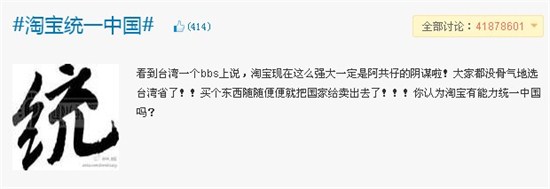 “淘宝统一中国”成新浪热门话题\t 大陆网友称,没想到把台湾纳入包邮范围威力如此大,这么多年终于找到和平统一的门路了,祖国统一指日可待。还有大陆网友称,“应该更狠点,不选台湾省就不发货”,只要炎黄子孙团结一心就无所不能,“淘宝统一中国也不是不可能”。