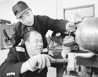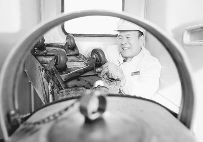 每次开车前老杨都要花4个小时准备,其间要在18节车厢里来回奔走,差不多相当于10公里路。所有与茶炉相关的活儿,如上煤、清渣、灌水、送水、修壶也被他全包。久而久之,大家就都叫他“壶司令”。自23岁从父亲手中接过信号旗以来,老杨从没有离开过锅炉、从没离开过水壶。