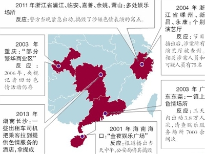 同样,中国也不止东莞的色情行业被媒体曝光。离东莞不远的惠州、深圳、珠海、中山等,也成为过类似报道的发生地。迈出东莞周边,央视等媒体还对海南、浙江、湖南等省份的部分城市,进行过暗访。我们试图用数字将其串联,以呈现这一行业的部分现状。