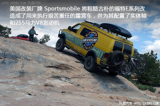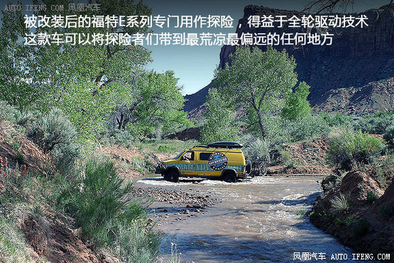 被改装后的福特E系列专门用作探险:由于采用了吊装车顶,这款福特E系列对爱冒险的夫妻或朋友来说,空间足够大;又得益于全轮驱动技术,这款车可以将他们带到最荒凉偏远的任何地方。
