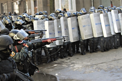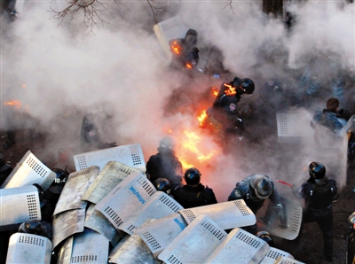 18日晚间,乌防暴警察将示威者驱赶回他们的大本营——独立广场,并开始清场行动。