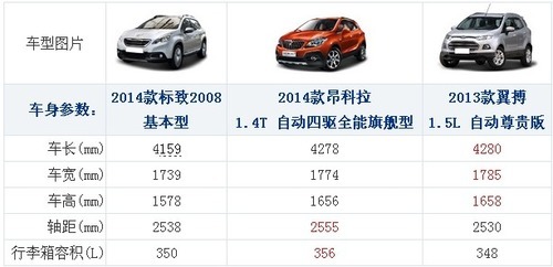 近几年SUV市场发展迅猛,不但中大型SUV销量提升,在紧凑型和小型SUV市场都要涌现出不少新车,竞争日益激烈。如今在小型SUV市场中上海通用别克和长安福特已经在合资车企中率先推出了昂科拉和福特翼搏,今年二季度上海通用雪佛兰旗下的首款小型SUV——TRAX创酷也将上市。那么,东风标致2008和已经上市的竞争对手相比,其竞争力如何呢?