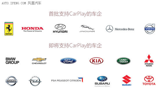 在2014日内瓦车展上,苹果公司正式将CarPlay系统推进到汽车中,首批在车展上展出的车企有沃尔沃、奔驰和法拉利,而本田、现代、捷豹也是首批跟进者。宝马、丰田、通用汽车、福特、路虎、起亚、三菱、日产、标志、斯巴鲁、铃木等也会在日后推出支持CarPlay的新车。