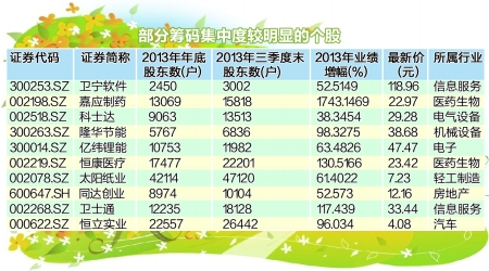 业内人士分析,上市公司股东户数减少,通常表明主力资金在吸筹,而筹码集中度上升的个股,往往具备更好的后市操作机会。上海证券投资顾问黄昌全认为,投资者可重点关注2013年业绩持续稳定增长、所属行业景气度明显回升的个股,这类个股有可能因为机构投资者的持续买入而实现筹码集中度的进一步提升。