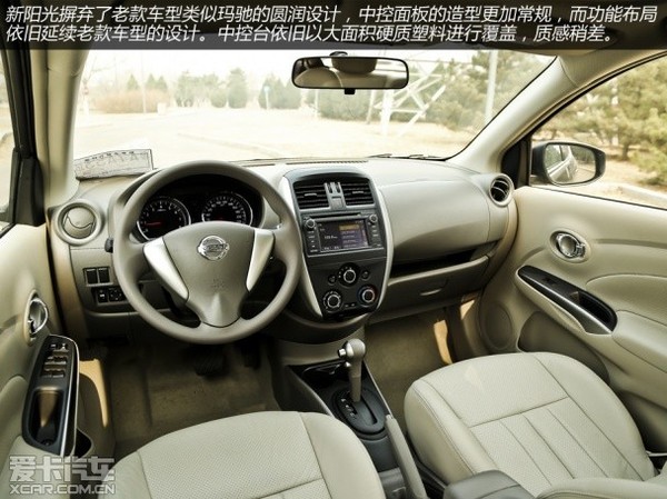 内饰方面,改款后的新阳光摒弃了老款车型类似玛驰的圆润设计,中控面板的造型更加常规,而功能布局依旧延续老款车型的设计。方向盘也换成了与骐达一致的样式,只不过缺少了真皮包裹,手感并没有什么提升。