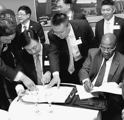 南非国有运输集团1064台机车订单签约仪式17日在约翰内斯堡举行,图为两国公司签署合同。