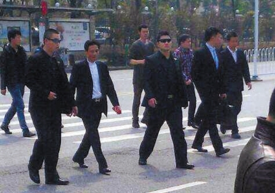 昨日,谢小青在多名黑衣人的护送下离开法院。