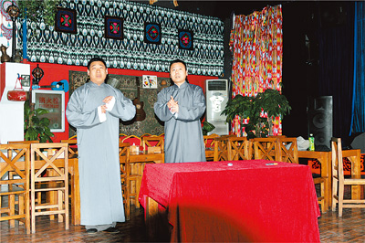 马春然(右)与搭档王继涛在演出相声《四大名旦》。