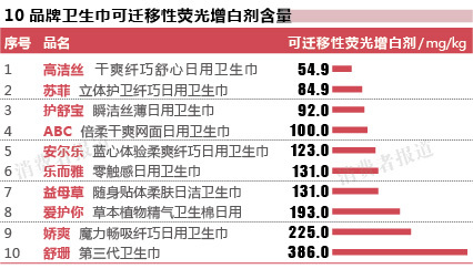 苏菲等10品牌卫生巾均含荧光增白剂 舒珊含量最高