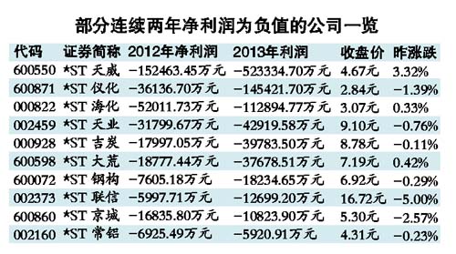 如上市公司连续三年亏损,将暂停上市。而记者根据已公布业绩的上市公司年报来看,*ST集团、天津普林、中国服装等16家公司2012年和2013年归属于上市公司股东的净利润出现亏损。其中,*ST天威去年净利润亏损52.33亿元,*ST海化、*ST仪化等亏损都超过10亿元,短期内如无重组或借壳,2014年继续亏损以及被暂停上的可能性较大。![]()