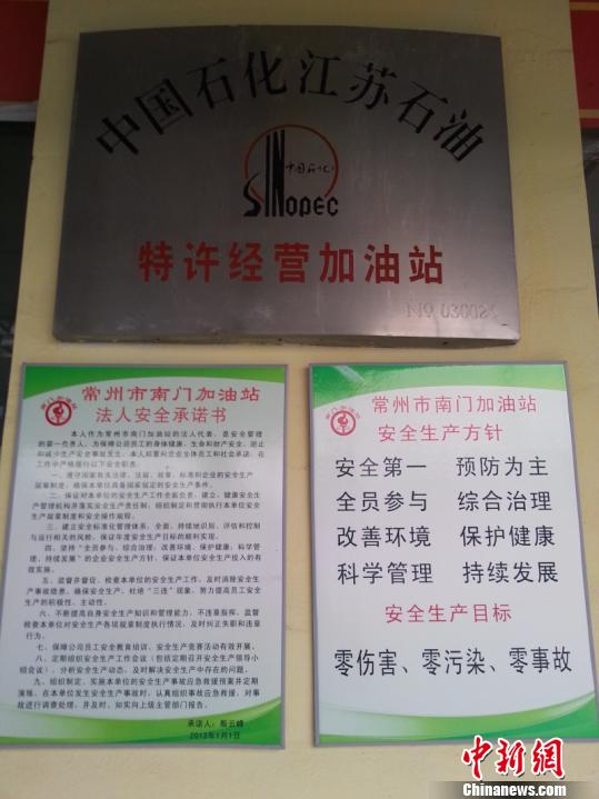 加油站内挂着中国石化江苏石油特许经营的牌子唐娟摄