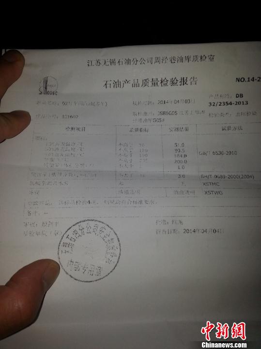 14日,记者再次来到南门加油站,在加油站,看到了中国石化江苏石油特许经营的牌子。该加油站的负责人,再次向记者表示,他们的油品就是从中石化购进的,并向记者出具了中石化江苏无锡分公司的进货发票及油品质量的检测报告。