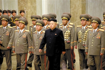 15日,平壤,朝鲜国防委员会第一委员长金正恩在崔龙海和张正男等军界高级干部的陪同下赴锦绣山太阳宫参拜金日成的遗体。