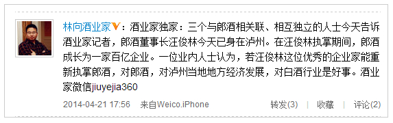 凤凰财经综合 第一财经日报记者林向4月21日在其微博披露,三个与郎酒相关联、相互独立的人士证实,郎酒董事长汪俊林今天已身在泸州。此前有消息称,因卷入成都当地一起案件,汪俊林已被有关部门要求协助调查。