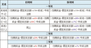 除了奖级减少外,此次调整最引人关注的是一等奖的奖金分配方案调整。当上期奖池低于1亿元时,一等奖占比不变,仍为当期浮动奖金的75%与奖池累积资金之和;当上期奖池高于1亿元、低于3亿元时,一等奖奖金分两部分,一部分为浮动奖金的58%奖池与奖池累积资金之和,由中奖注数均分,另一部分为浮动奖金的17%,由中奖注数均分;当上期奖池高于3亿元时,一等奖奖金分两部分,一部分为浮动奖金的42%奖池与奖池累积资金之和,由中奖注数均分,另一部分为浮动奖金的33%,由中奖注数均分。上述两部分奖金单注奖金皆为封顶500万元。