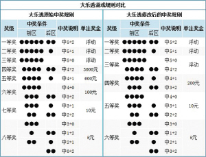 据悉,变更规则后,大乐透共设6个奖级,一、二、三等奖为浮动奖,四、五、六等奖为固定奖。