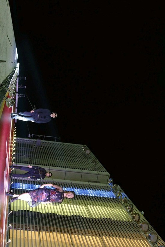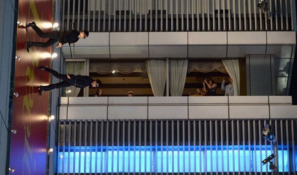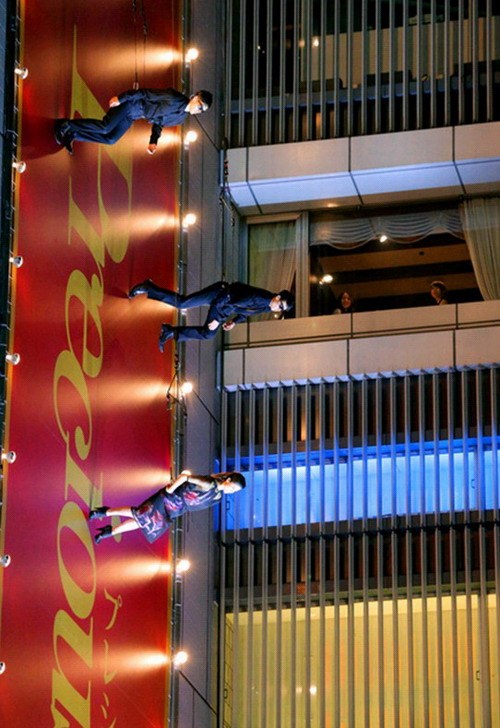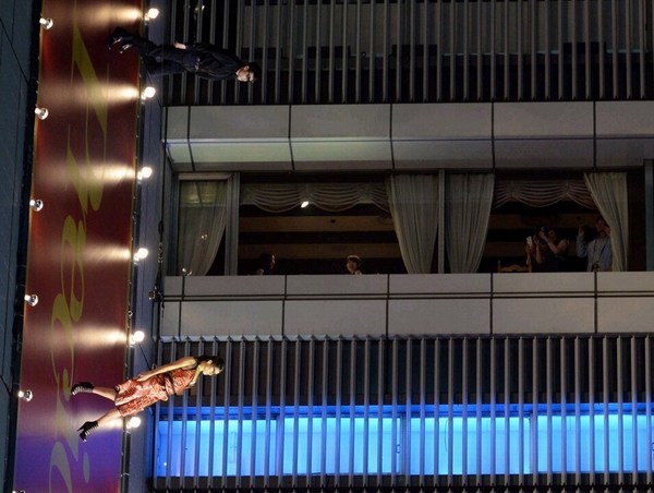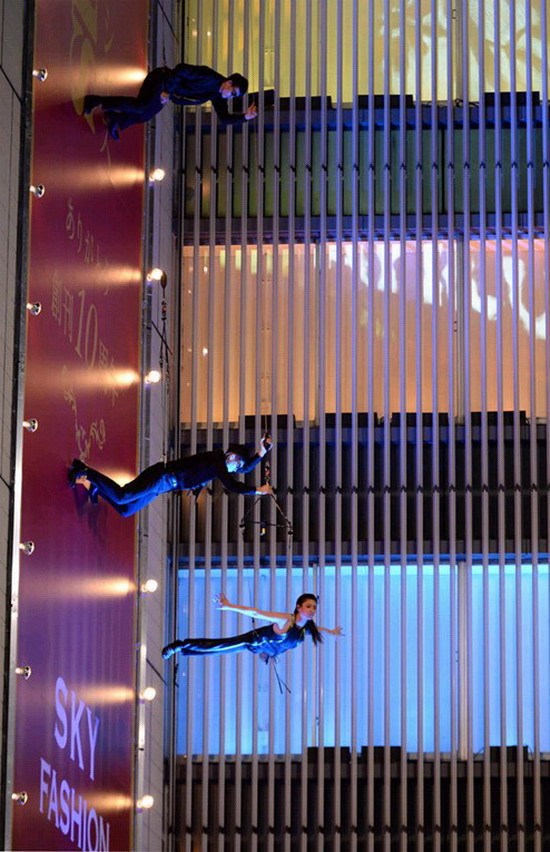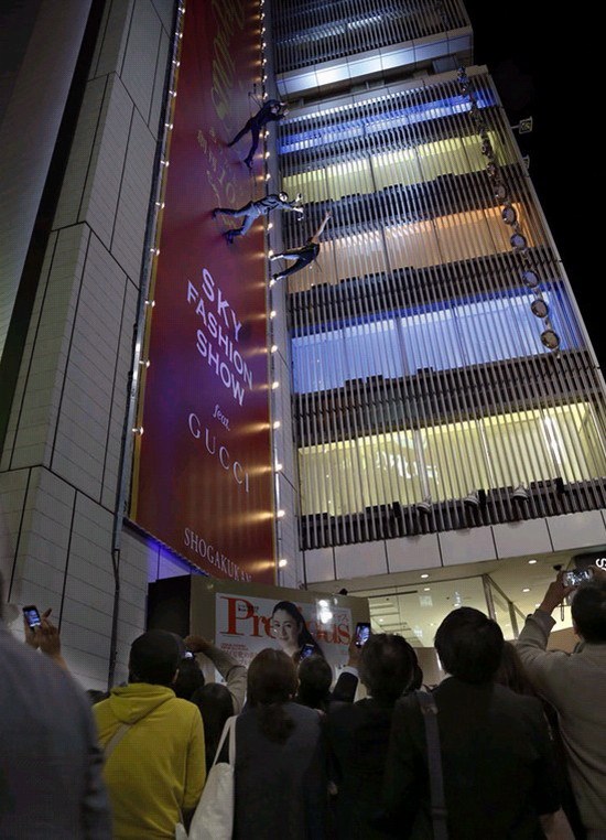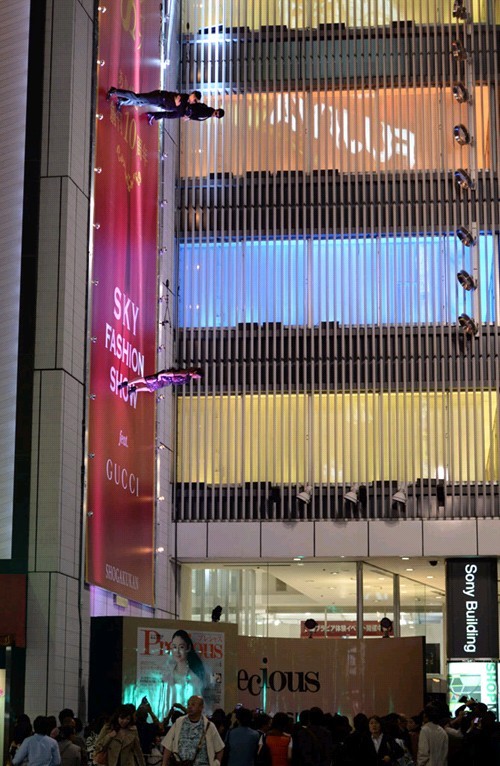 国际在线专稿:据日本《朝日新闻》5月8日报道,日本东京银座7日上演了一场“飞檐走壁”式时装秀。模特身着高级品牌服装,吊着威亚,在42米高的“墙壁T台”为观众献上了华丽的表演。