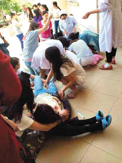 昨日,云南大学滇池学院被砍学生正在接受紧急治疗。昨日下午1时许,一男子爬上该校女生宿舍二楼持刀行凶,两名女生受伤。图/CFP