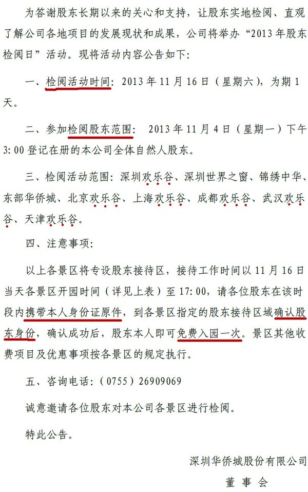 2013年11月7日,华侨城A发布一则题为《股东检阅日活动》的公告,称11月4日下午3:00登记在册的华侨城A全体自然人股东,可于11月16日(星期六)携带本人身份证去欢乐谷各景区指定股东接待区确认身份,即可免费入园一次。检阅活动范围包括深圳欢乐谷、深圳世界之窗、锦绣中华、东部华侨城、北京欢乐谷、上海欢乐谷、成都欢乐谷、武汉欢乐谷、天津欢乐谷。公告中,华侨城A还给出了各个景点的地址和开园、闭园时间。