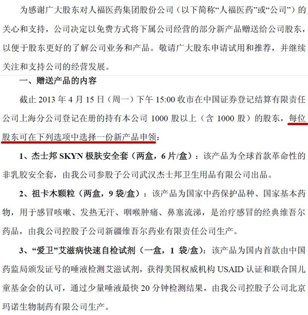 人福医药在2012年奇葩分红方案中称,公司免费方将向股东免费赠送新产品,安全套、感冒药和艾滋病快速自检试剂三选一。原公告为,“每位股东可在下列选项中选择一份新产品申领: 1、杰士邦SKYN极肤安全套(两盒,6片/盒);2、祖卡木颗粒(两盒,9袋/盒);3、“爱卫”艾滋病快速自检试剂(一盒,1袋/盒)。”