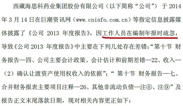 来自:西藏海思科药业集团股份有限公司关于2013年度报告的更正公告